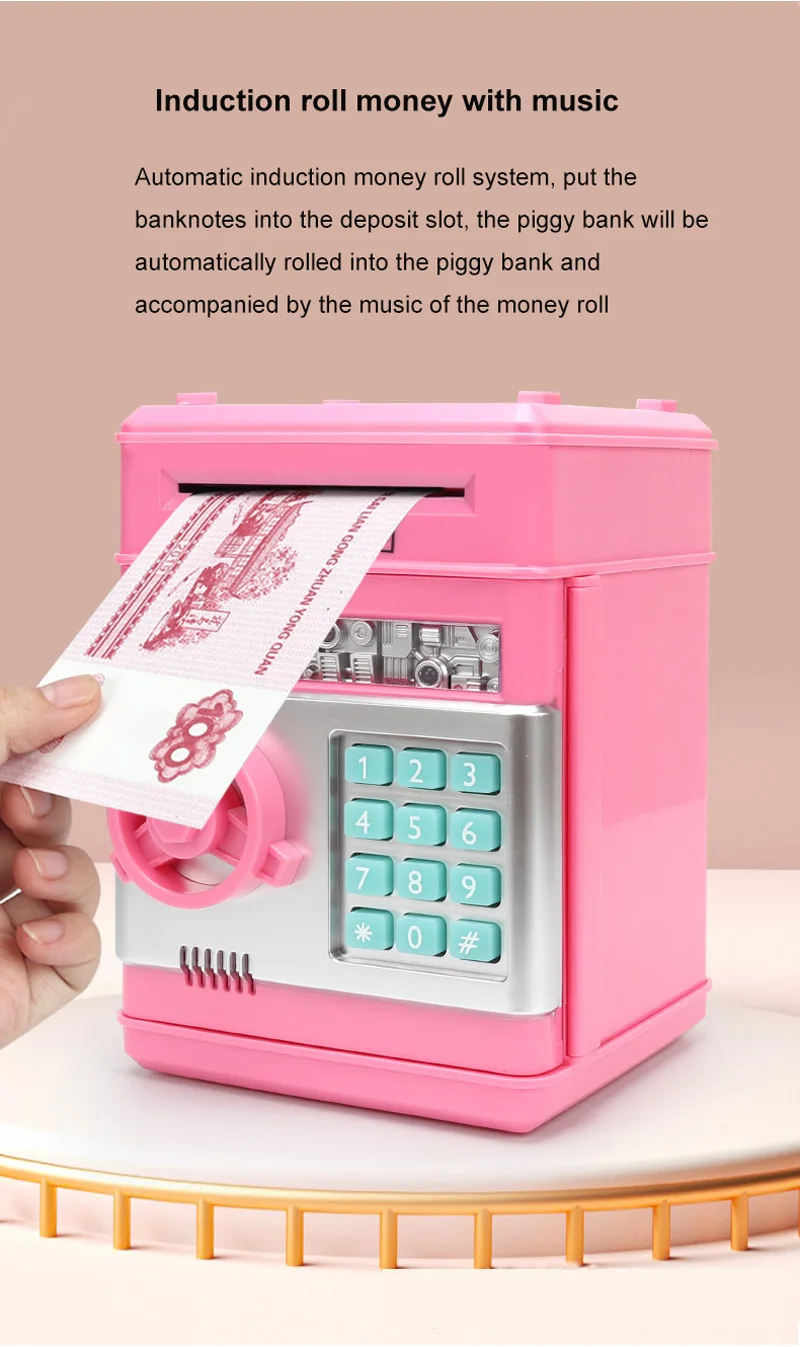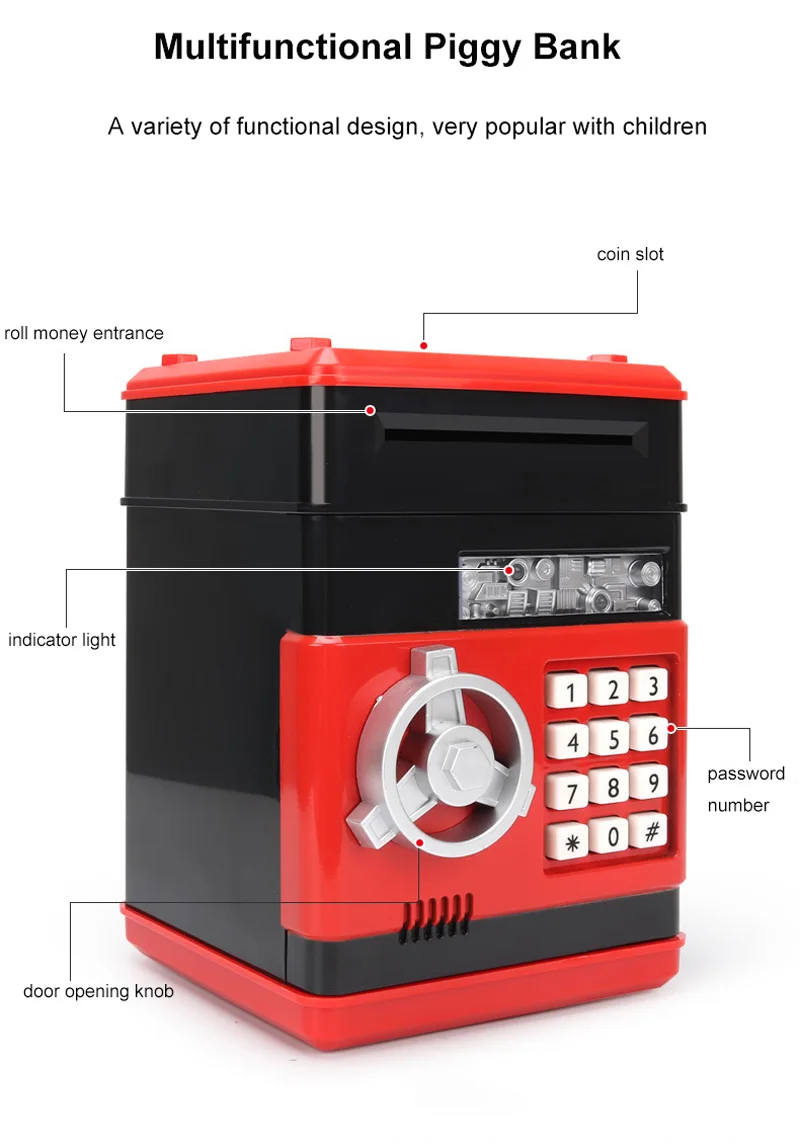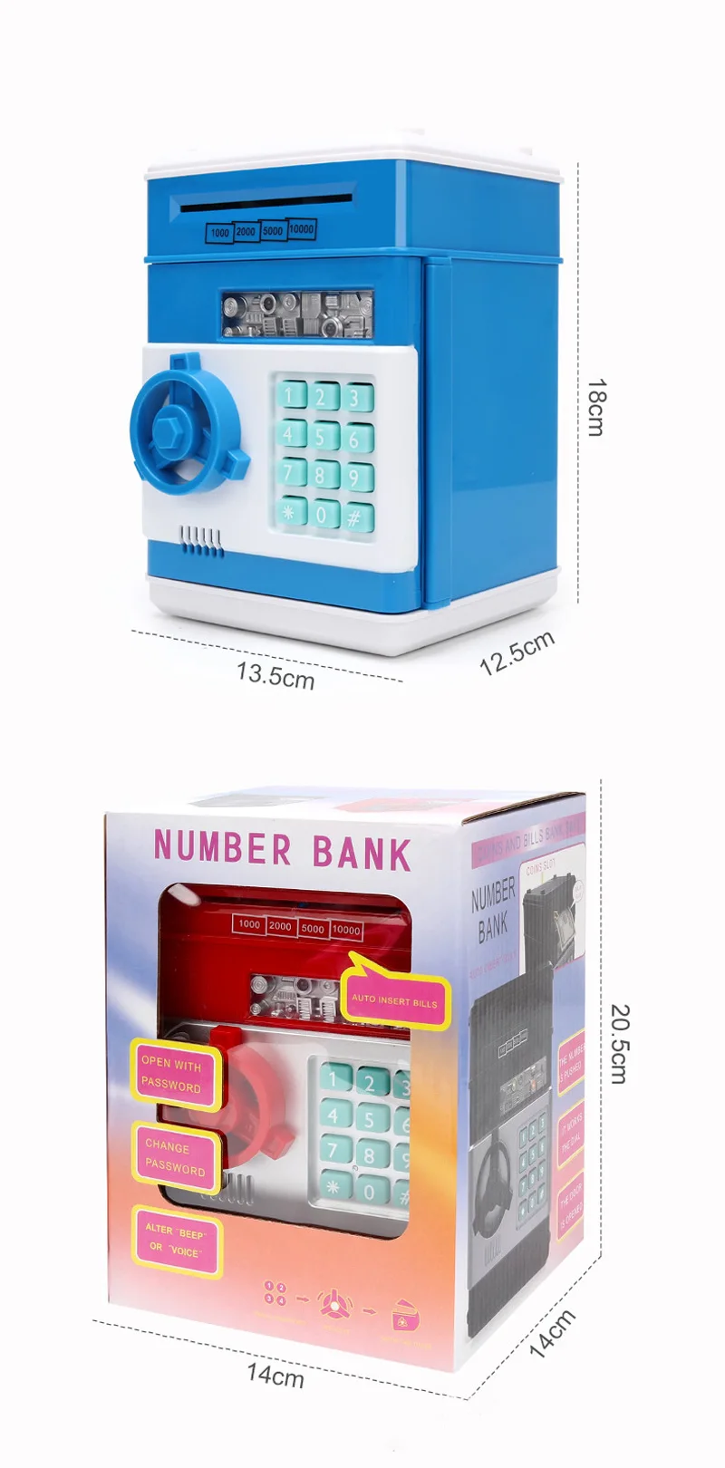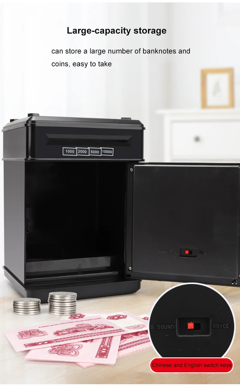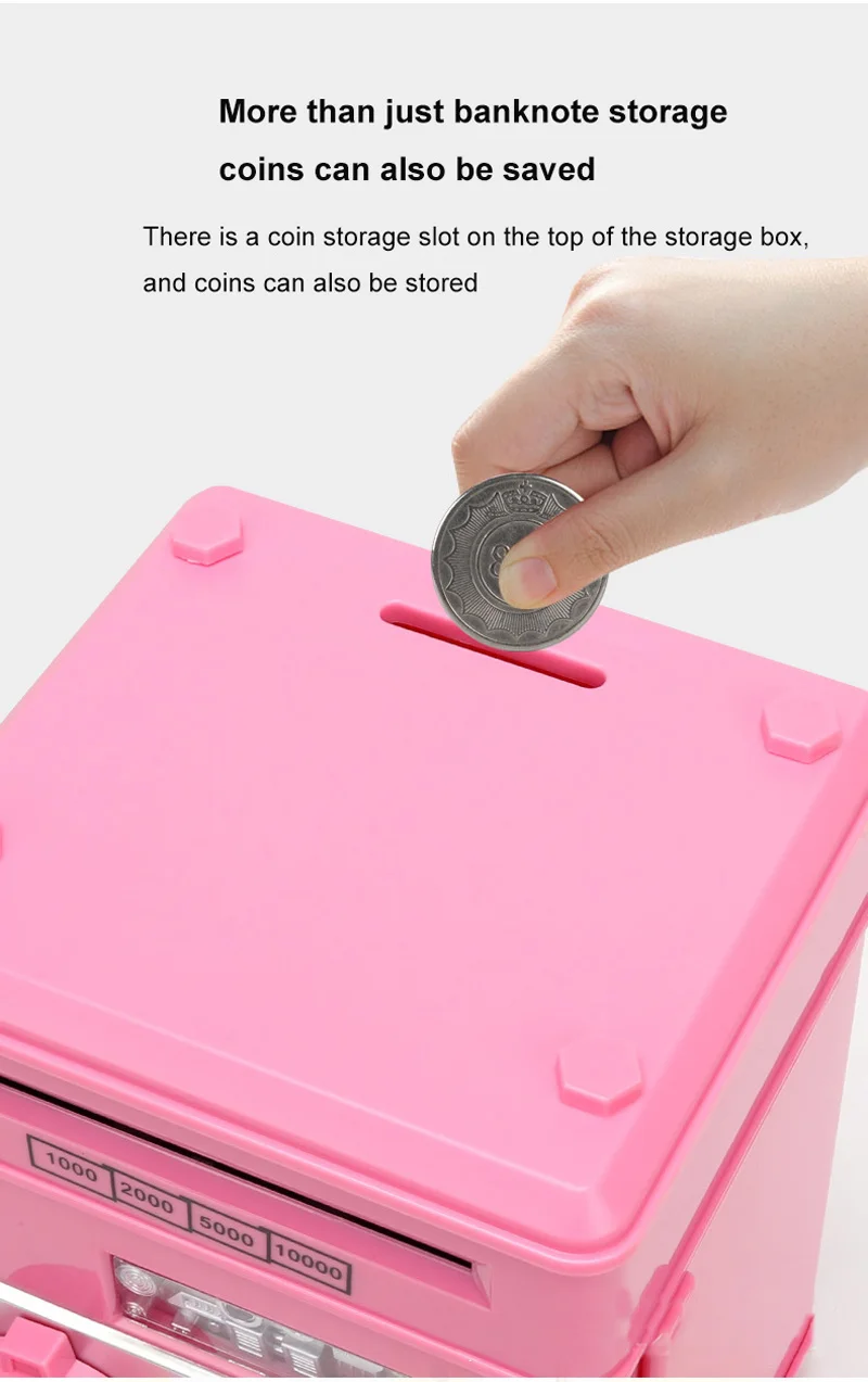 With a password, voice, in addition to saving money, but also to establish savings goals, financial planning. Can be used to store toys, jewelry, bankbooks, etc. The slot in the coin slot can hold COINS or paper money.