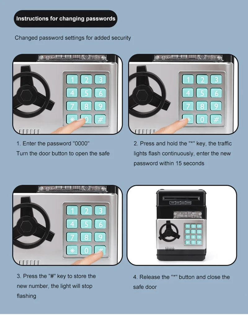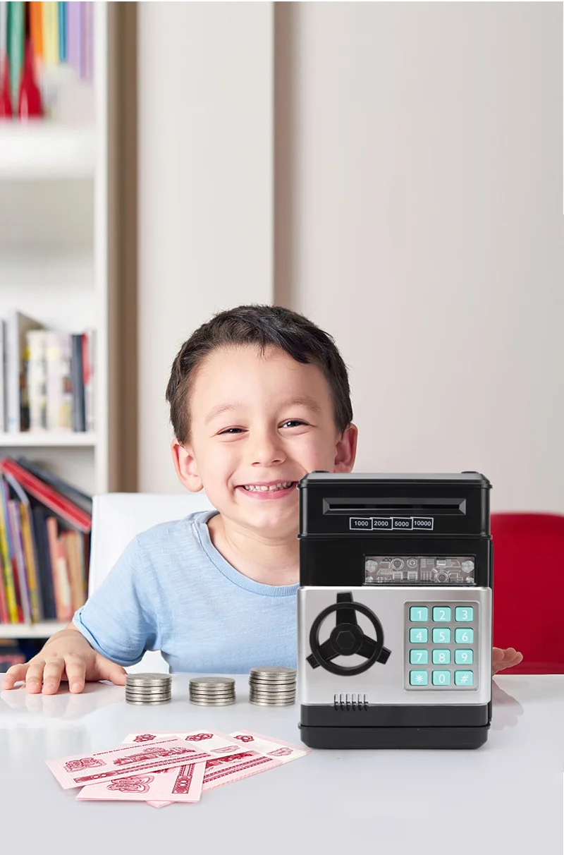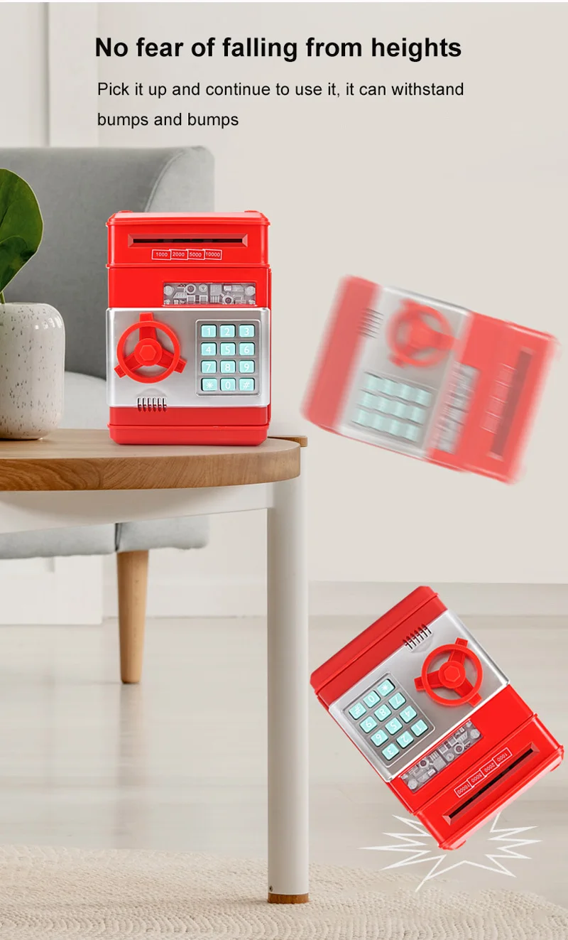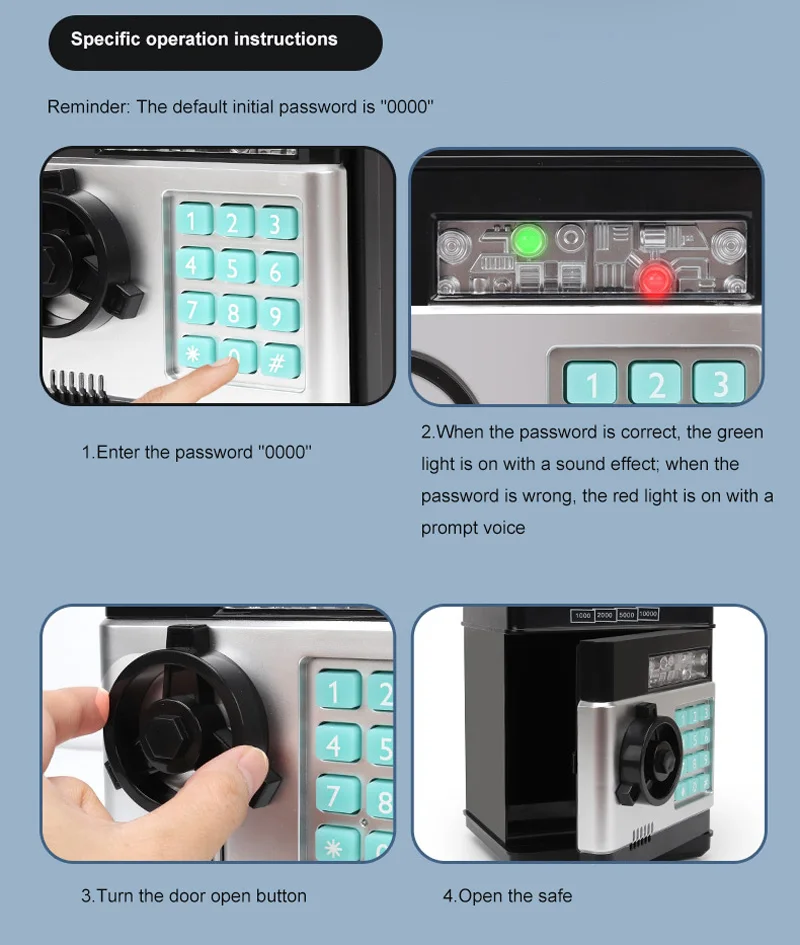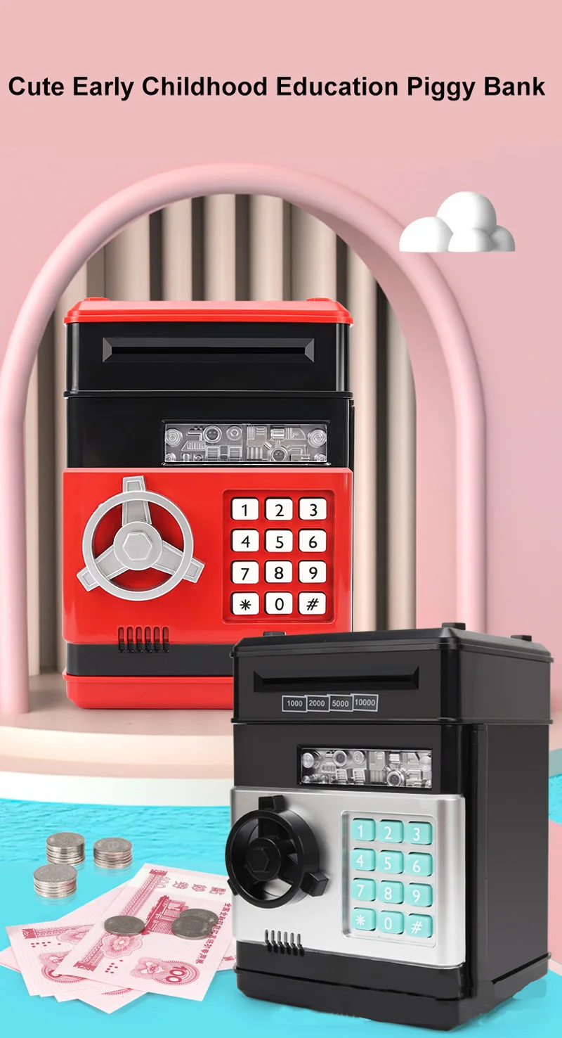 With a password, voice, in addition to saving money, but also to establish savings goals, financial planning. Can be used to store toys, jewelry, bankbooks, etc. The slot in the coin slot can hold COINS or paper money.